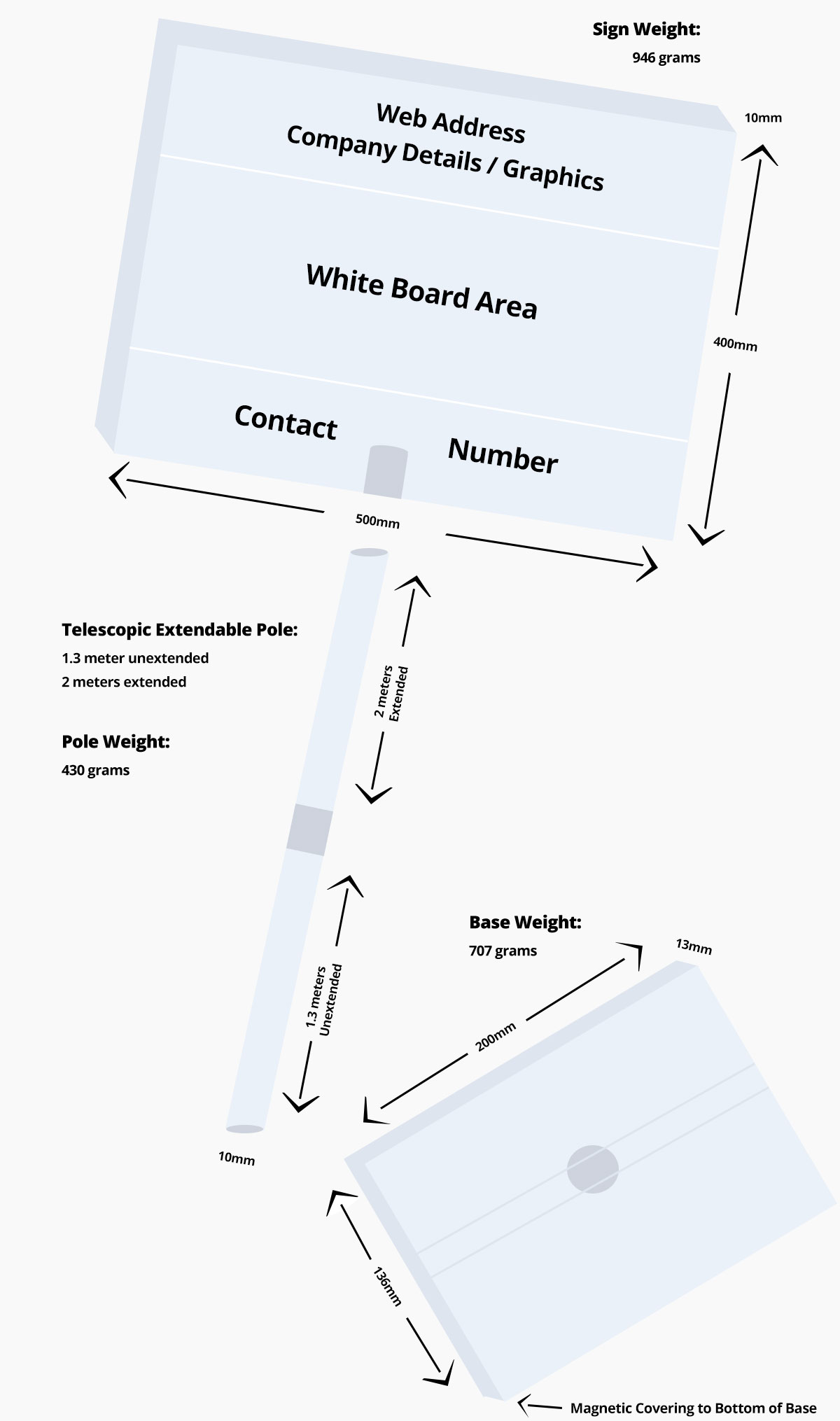 To raise the sign to the required height simply pull up the inner part of the pole by the screw top and twist clockwise until finger tight then attach the sign to the screw top part of the pole by twisting it on clock wise until finger tight in readiness for use. Once completed to detach the sign from the pole twist anti clock wise until detached and twist the inner part of the pole anti clock wise and lower back into the base of the pole.